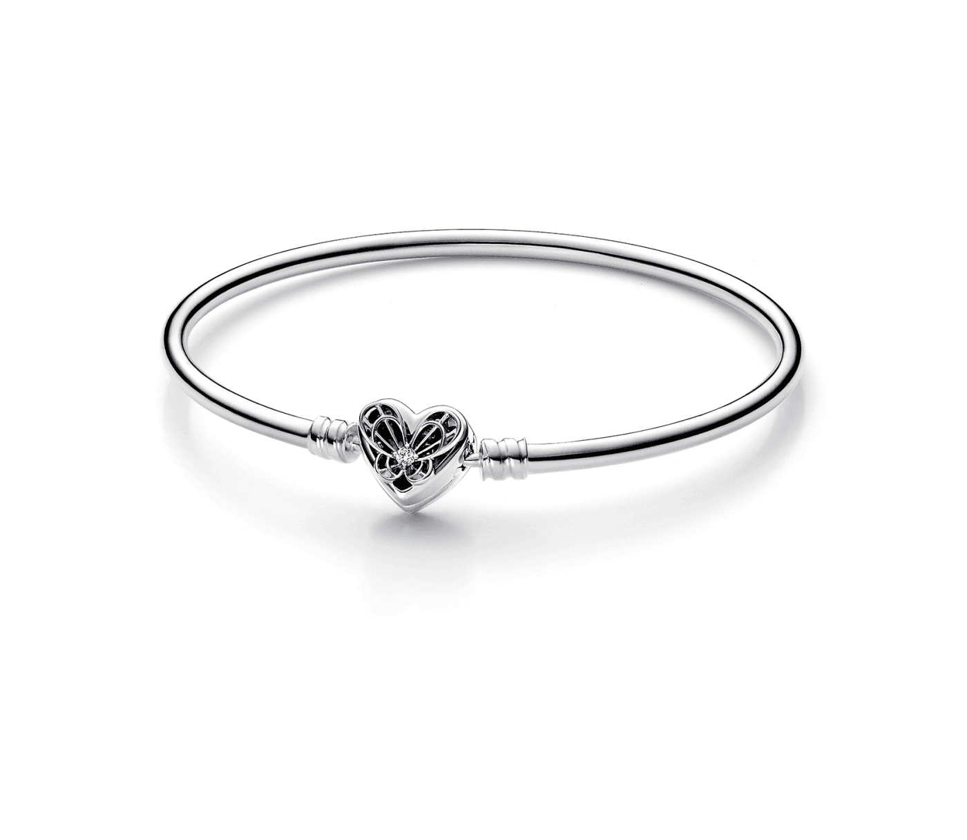 Elaborada en plata de ley, esta significativa pulsera tiene un cierre en forma de corazón que coloca el amor en el centro, decorado con detalles calados que emulan las alas únicas de una mariposa. Acabada con una circonita cúbica brillante en el centro, la pulsera rígida puede llevar hasta 16-18 charms