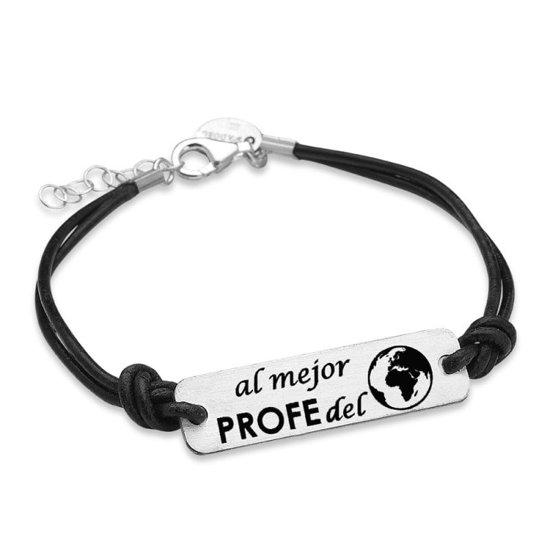 Pulsera grabada y esmaltada con mensaje «al mejor profe del mundo» en plata de Ley 925mls con cuero negro.