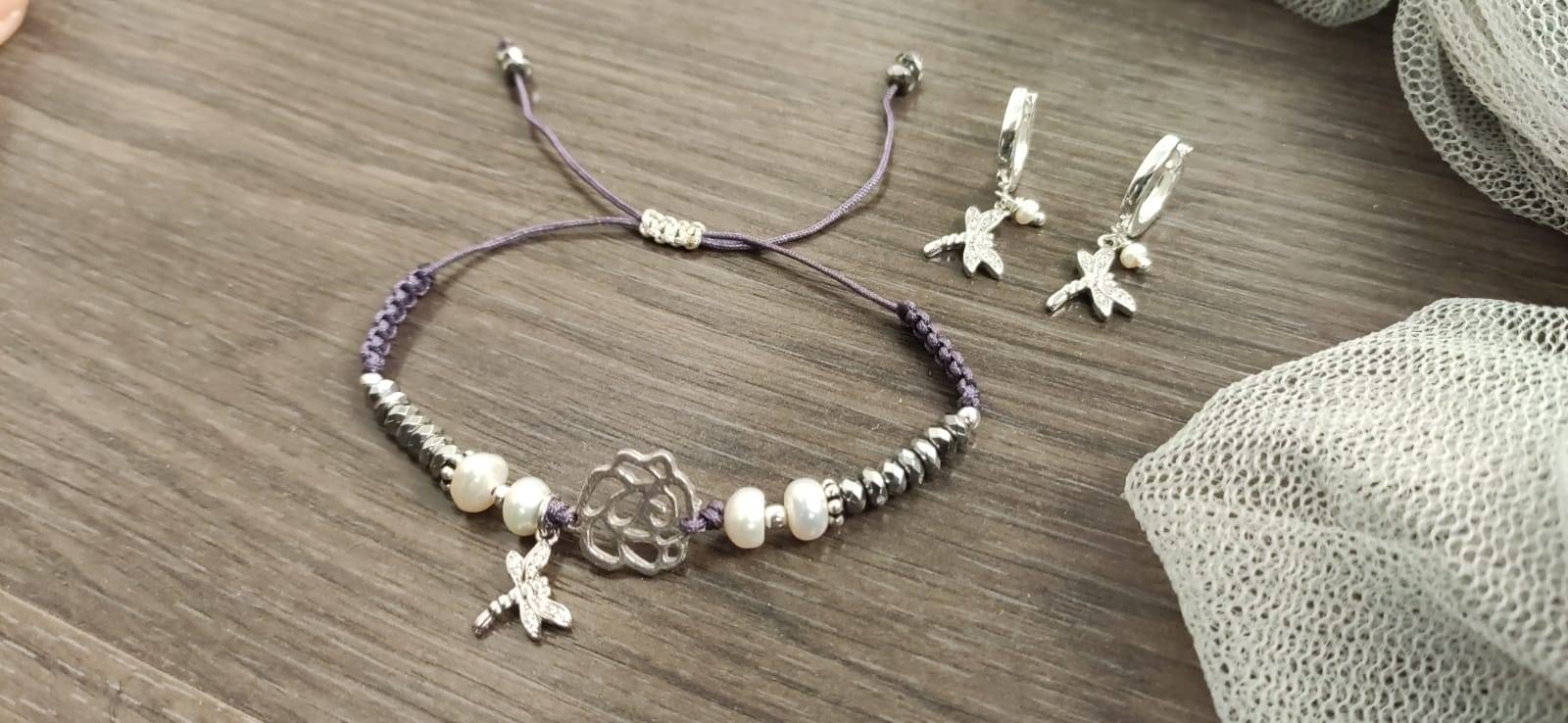 Pulsera “Vida” de la colección Pétalos by LolaLolae con piezas de plata y circonitas con perlas y hematites, montadas con macramé adaptable a cualquier medida.