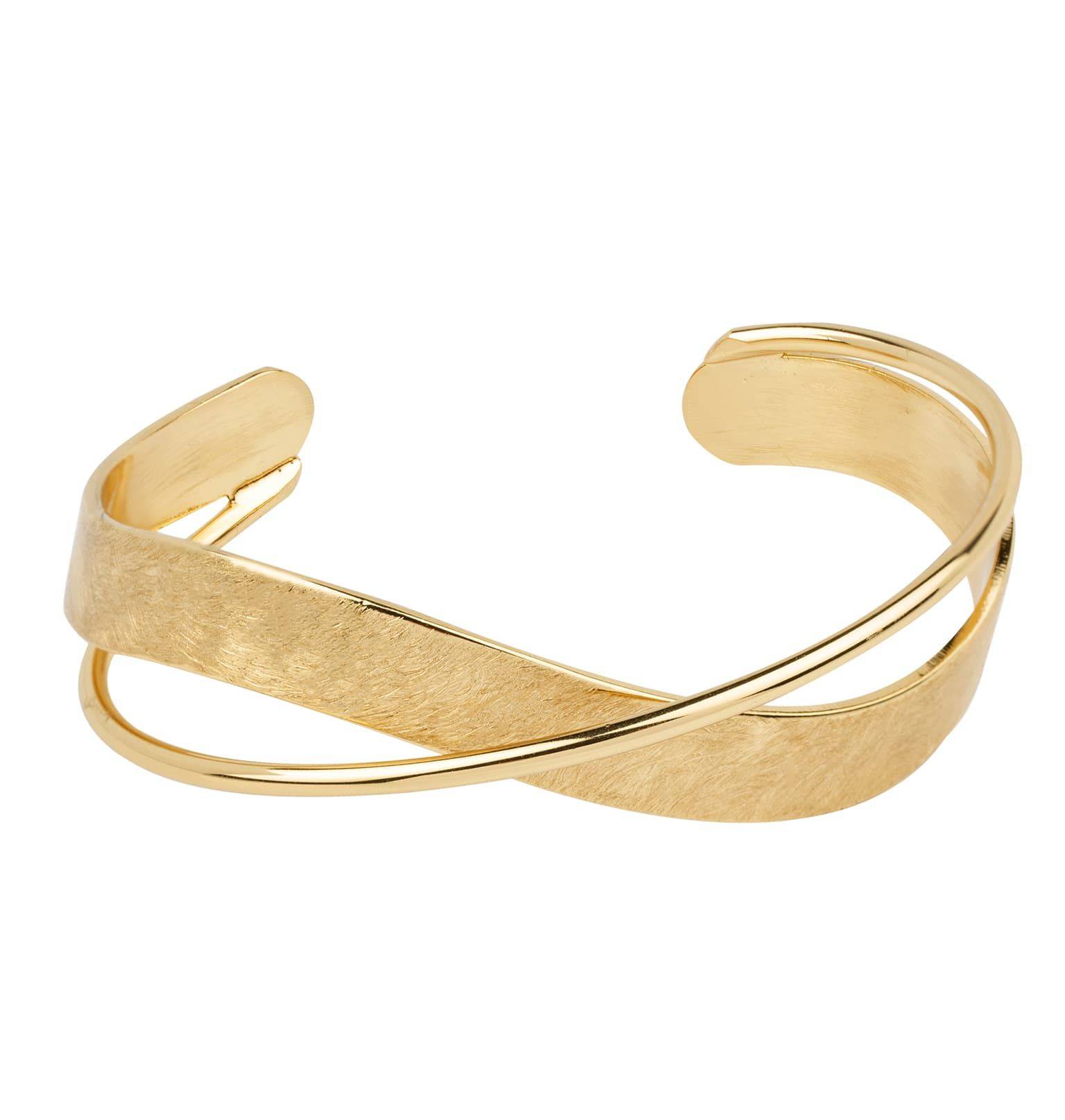 Pulsera rígida chapada en oro de 18ktes cruzada con texturas brillo y matizada.