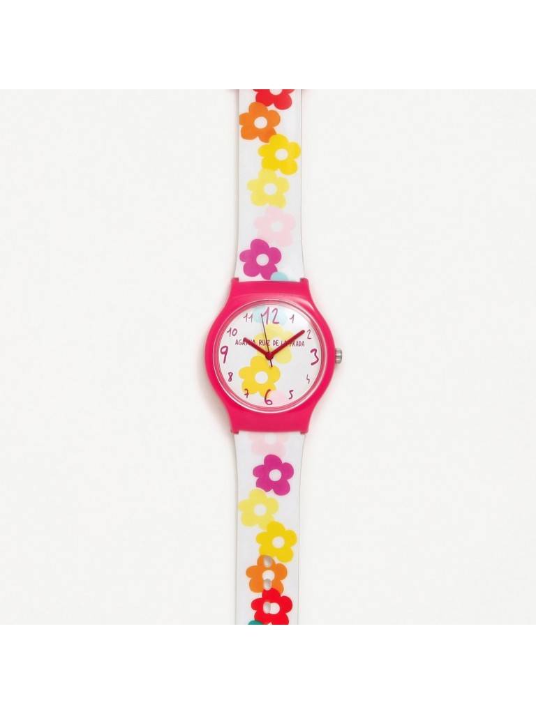 Reloj fantasía Agatha flores de colores sobre fondo blanco. La esfera con números de color fucsia y caja de 33mm de diámetro con correa de PVC. NO SE PUEDE MOJAR.