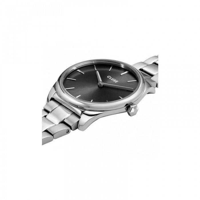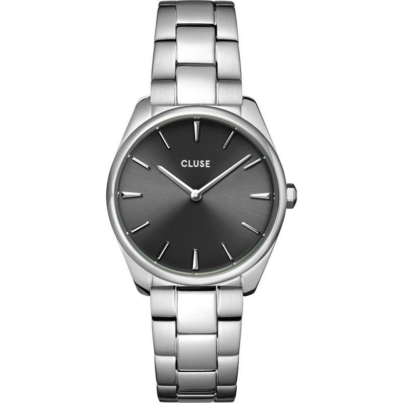 Reloj Cluse para muejr modelo Feroce Petite fabricado en acero inoxidable. Es un reloj de estilo elegante lleno, compuesto por caja de 32mm de diámetro con esfera en gris plomo con contiene índices y agujas plateadas movidas por mecanismo de cuarzo analógico protegido por cristal mineral. Su correa es de eslabones plateados con cierre desplegable. Resistente al agua hasta 50 metros.