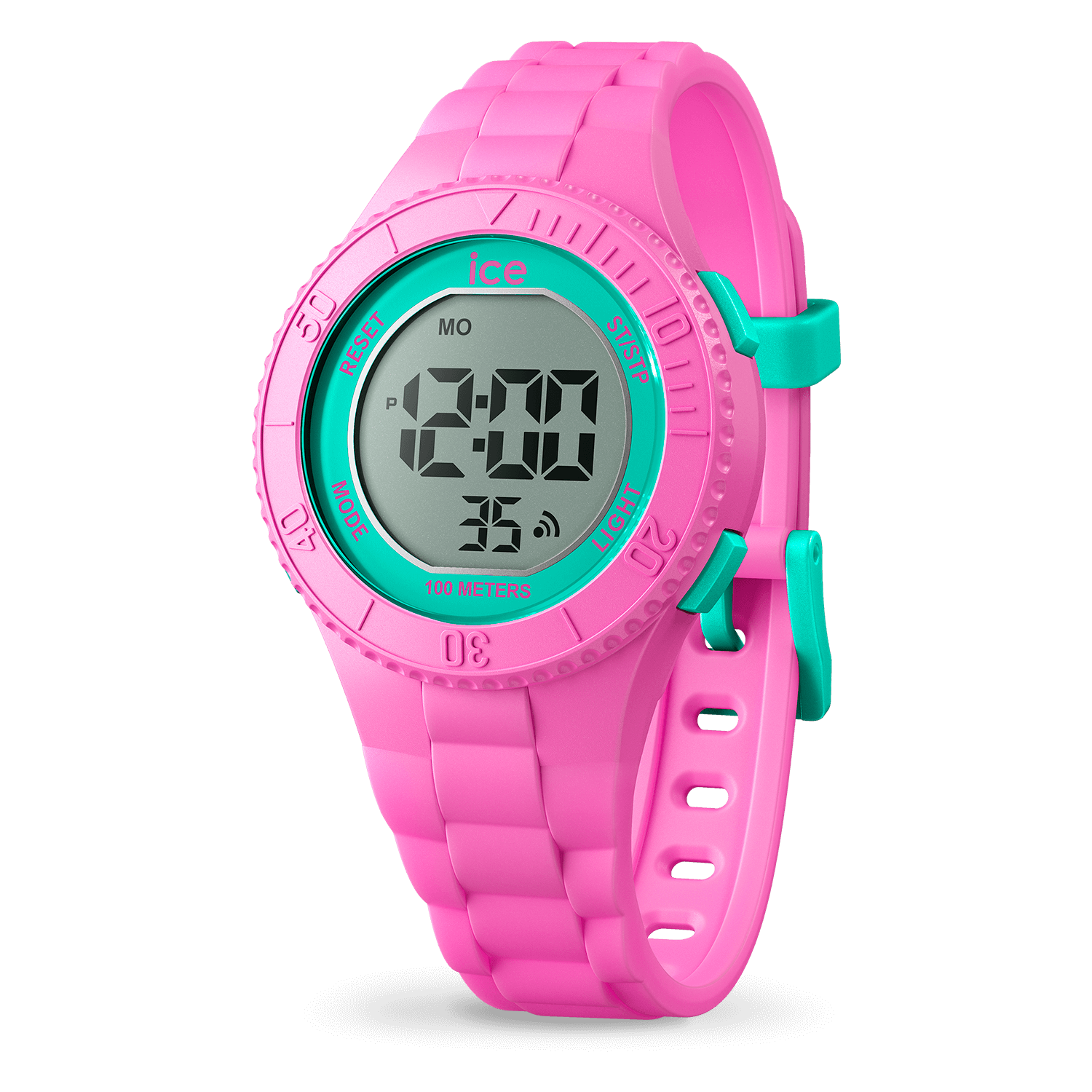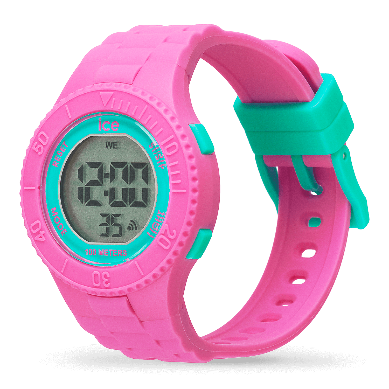 Reloj Ice-Watch IC021275 Digit Pink turquoise small de niña, tiene la caja de plástico con tratamiento de silicona con forma circular de color rosa. La correa es de plástico rosa y la esfera turquesa. Bisel numerado de color rosa. El cristal es mineral, movimiento cuarzo y el display digital. Funciones: Multifunción. Impermeabilidad: 10 ATM. Diámetro: 32mm.