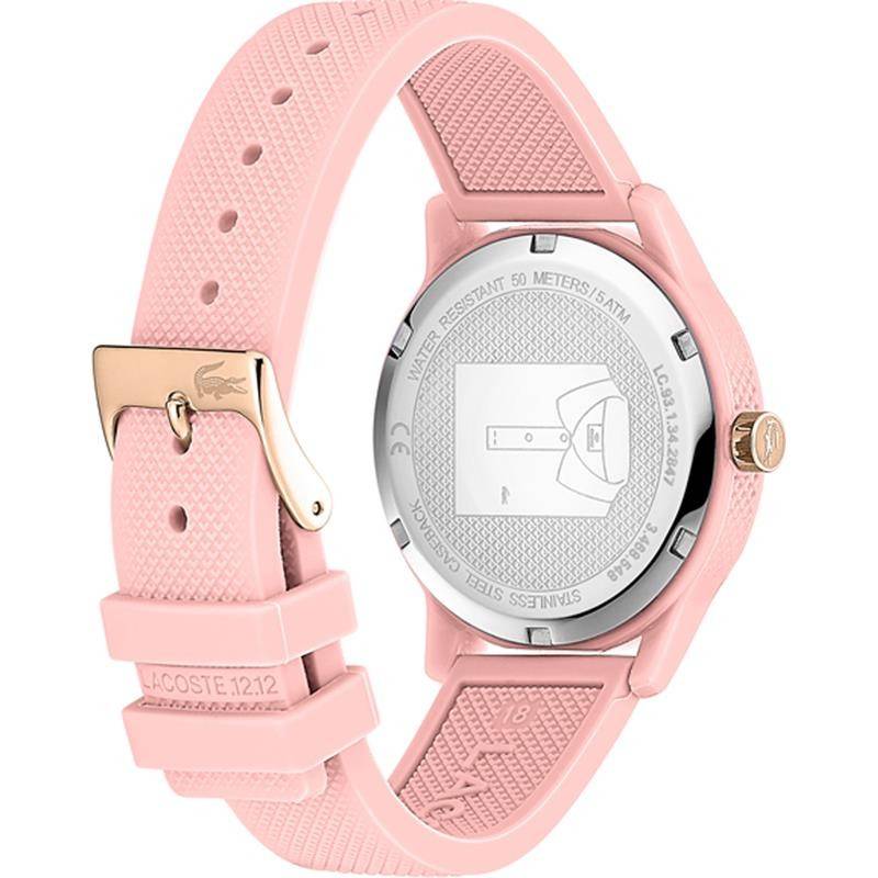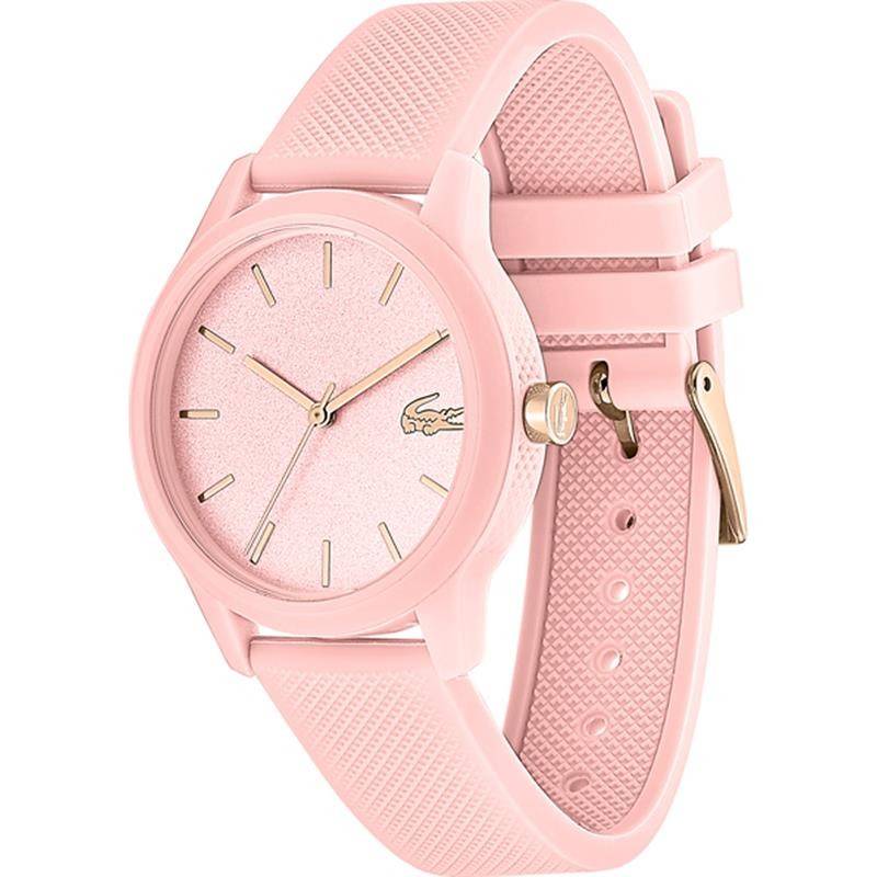 Reloj Lacoste Pink con caja lacada en rosa de 36mm de diámetro, esfera en rosa con índices y corona en IPRosa maquinaria de cuarzo y correa de silicona rosa claro. Resistente al agua 5 ATM.