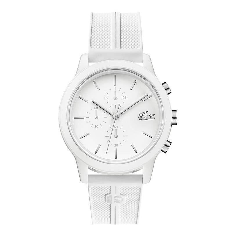 Reloj Lacoste para hombre en color blanco de la colección World Padel Tour. Se trata de un reloj que combina el diseño deportivo con la elegancia Lacoste, cuenta con caja de TR90 de 44mm con movimiento de cronógrafo de cuarzo protegido por cristal mineral. Su correa es de silicona en color blanco y posee el logotipo World Padel Tour, su cierre es de hebilla. Su resistencia al agua es de hasta 50 metros.