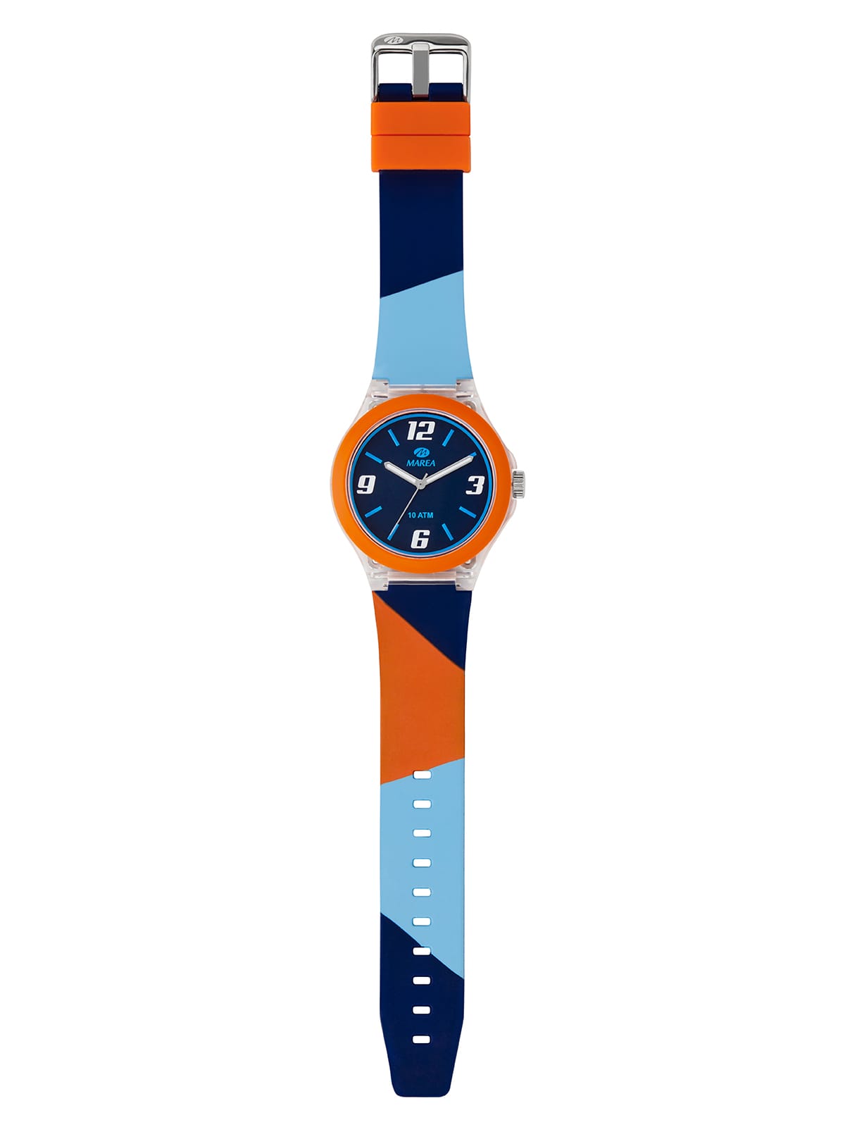 Reloj Marea Hombre B35354/1 Sport Naranja. Caja de plástico transparente de 44mm. Correa de silicona multicolor. Bisel naranja. Esfera azul y agujas blancas. Quartz. Sumergible 100m. 3 años de garantía. Ref. B35354/1