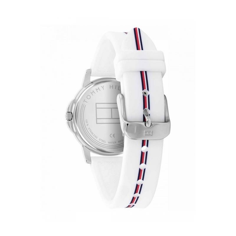 Reloj Tommy Hilfiger para niña de la colección de comunión fabricado en silicona y acero inoxidable. Se trata de un reloj de lo más original y atractivo compuesto por caja plateada de 32mm de diámetro con esfera blanca que contiene índices azules y agujas plateadas movidas por mecanismo de cuarzo analógico protegido por cristal mineral. Su correa es de silicona en color blanco con franjas azul y roja, posee cierre de hebilla. Resistente al agua hasta 30 metros.