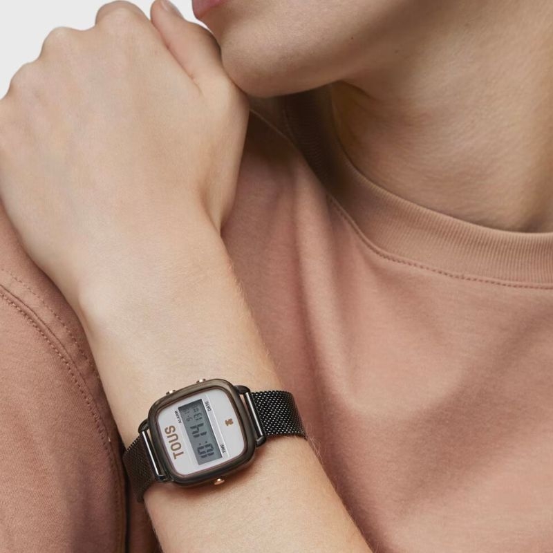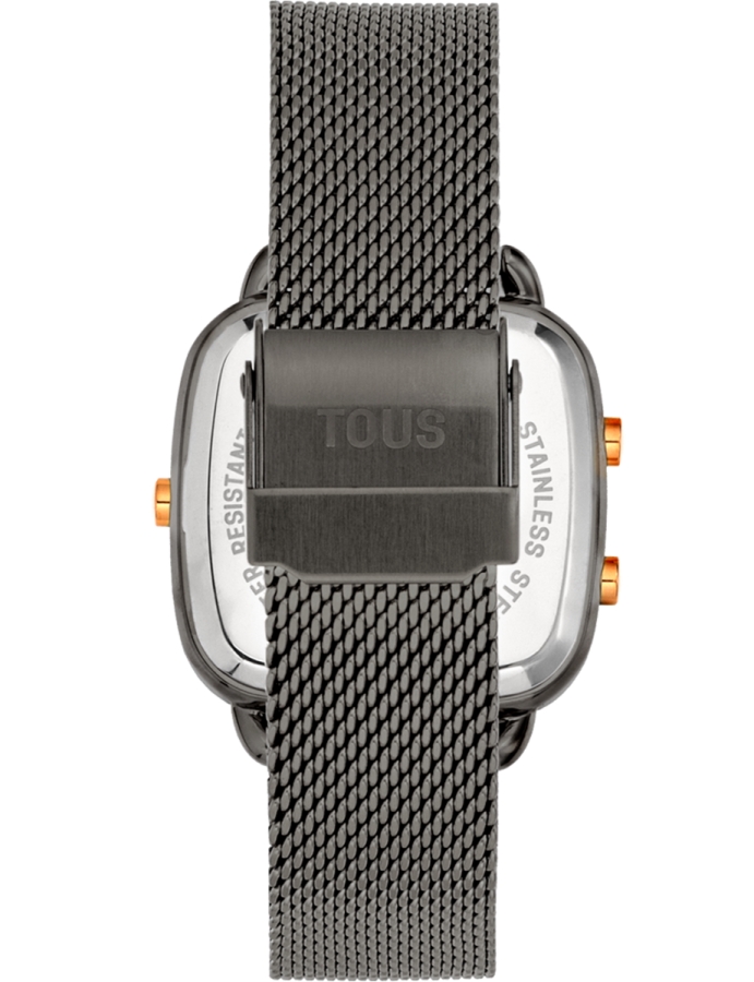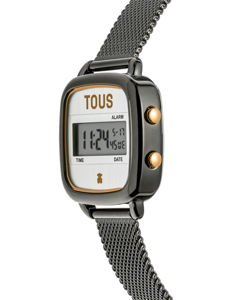 Reloj digital TOUS D-Logo New con brazalete de malla milanesa de acero IPG negro. Funciones: hora, minutos, segundos, día, mes, día de la semana, cronógrafo 1/100 segundos y alarma. Impermeable a 3 ATM. Batería: 3V litio CR2016 / 1,69 gramos (litio 0,025 gramos). Cierre ajustable con seguridad.
