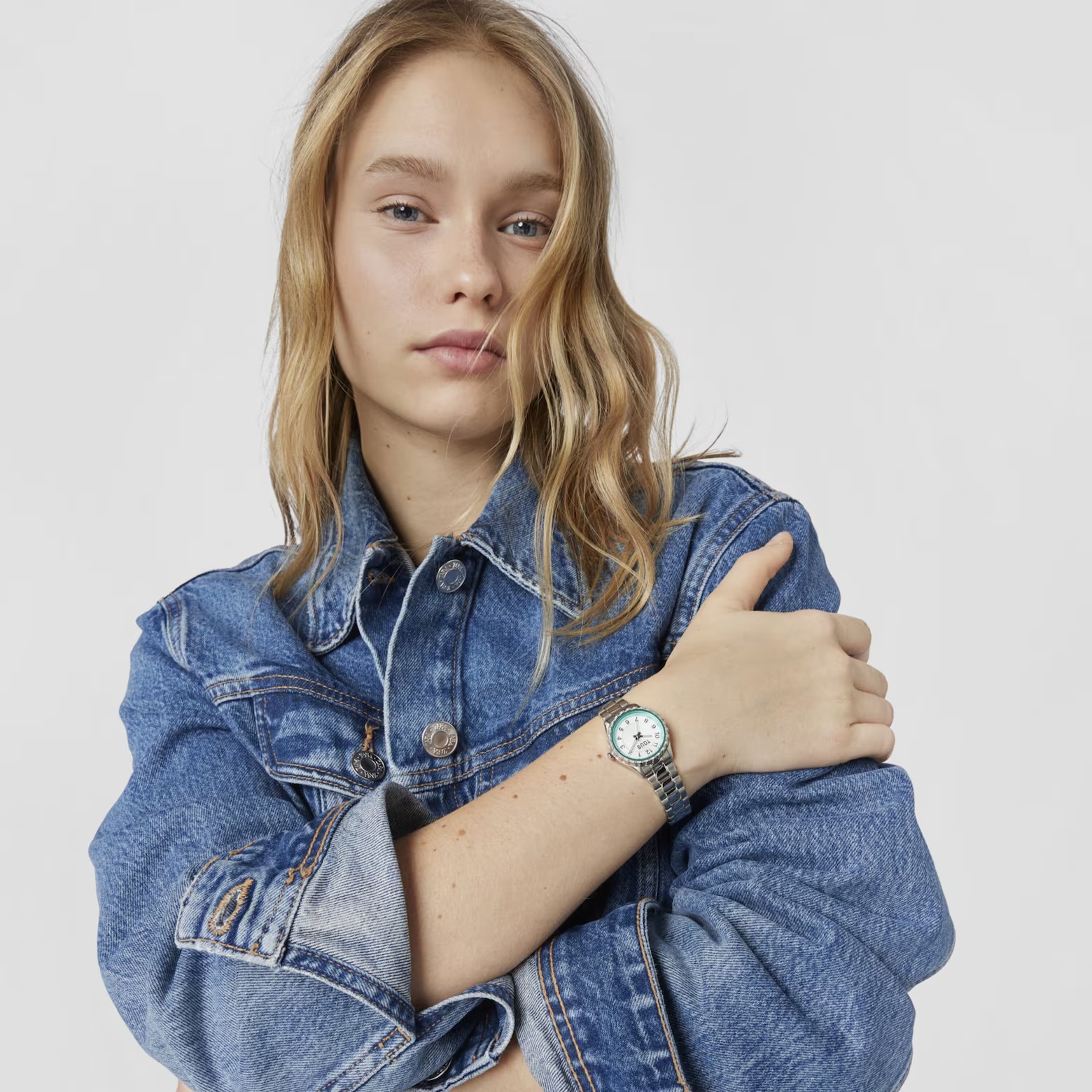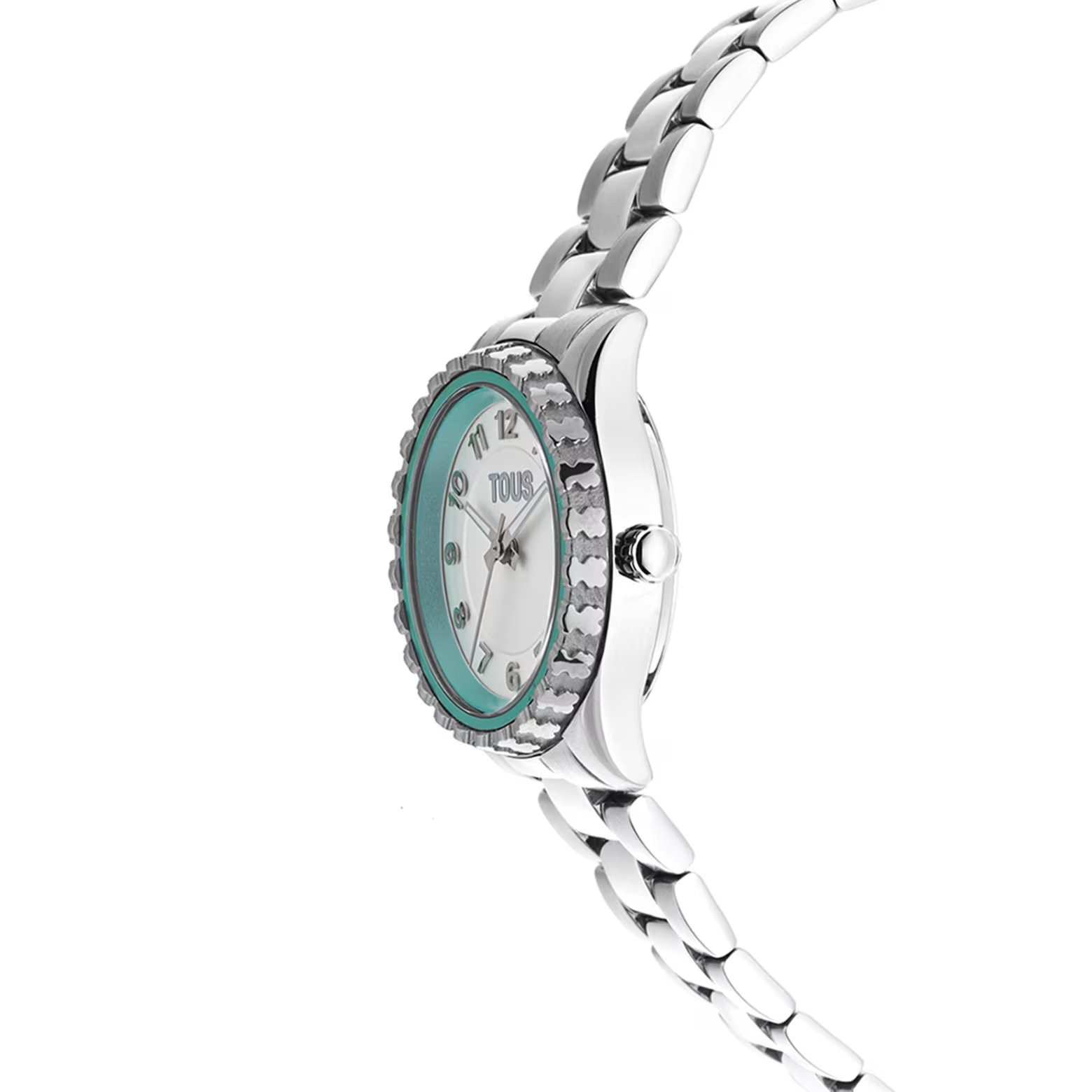 Reloj analógico niña TOUS Mini T-Bear con brazalete de acero inoxidable 316L y bisel interior de aluminio en color menta, diámetro 28,2 mm y bisel con osos en relieve. Funciones: hora, minutos y segundos. Impermeable a 5 ATM. Batería: 1,55V Oxido de plata SR621SW/0,4 gramos. Movimiento cuarzo japonés. Cierre desplegable con pulsadores.