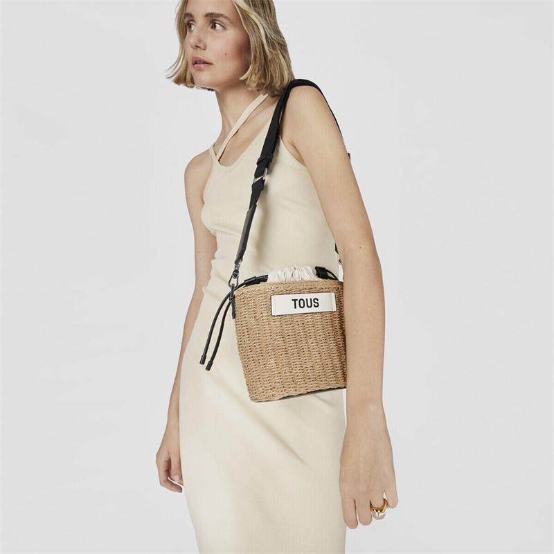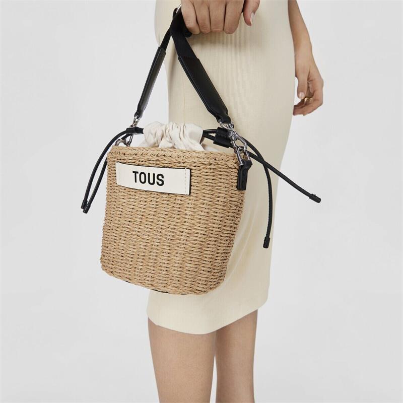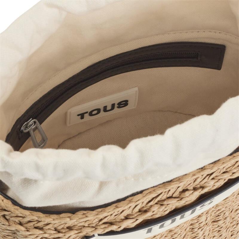 Bolso saca TOUS Scoubidou elaborado con rafia de mezcla de papel procedente de bosques sostenibles y materiales reciclados. También incorpora detalles de piel sintética en color negro. Cierre con cordón ajustable. Bolsillo interior con cremallera. Asa bandolera ajustable y extraíble. Medidas (alto x ancho x fondo): 18 x 21 x 13 cm.