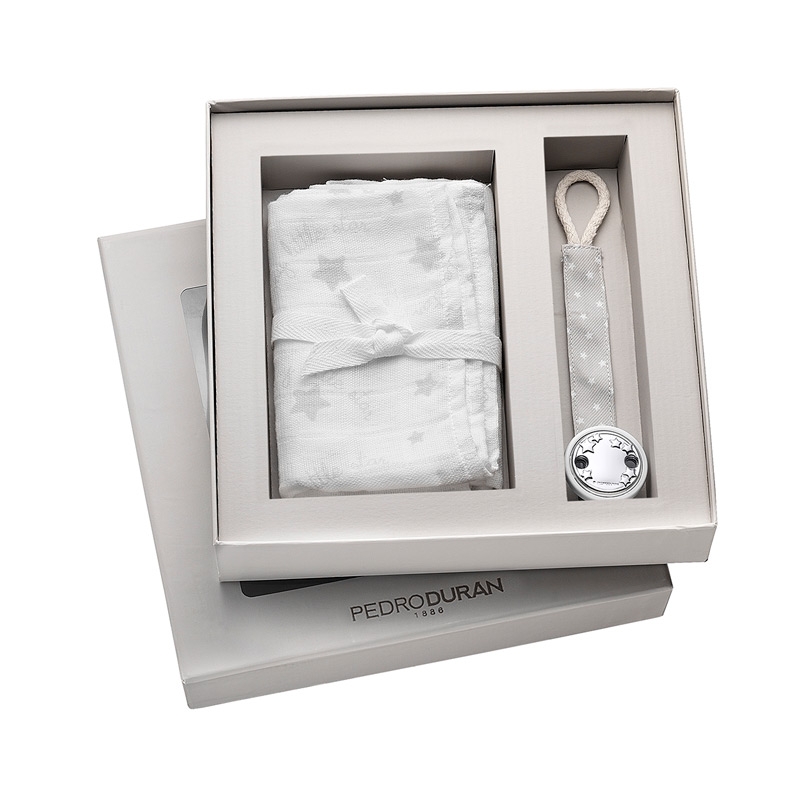 Presentación para recién nacidos de gama de muselina y pinza para chupete, modelo Stella de Pedro Durán. Decorados con estrellas la pinza para chupetes tiene la base blanca con placa en lámina de plata de primera ley firmada.